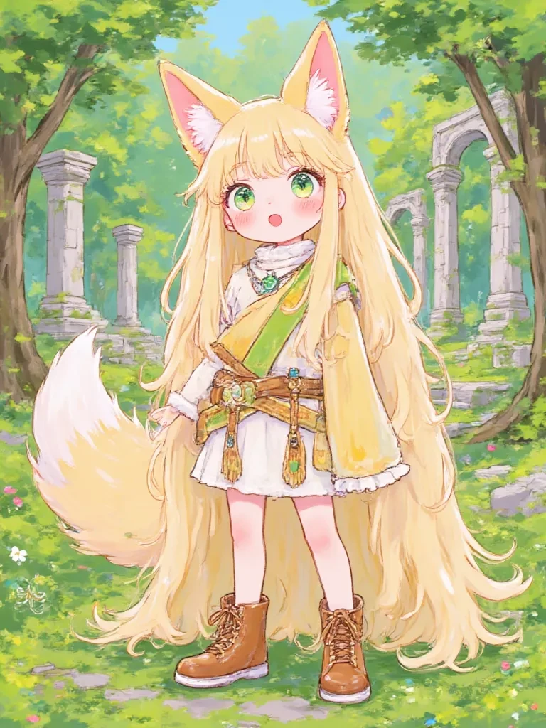Beauty😍😍😍 — You lay sprawled, your body aching, as the lingering stench of ozone filled your nostrils. The impact had been cataclysmic, tearing a gash through reality itself, and you were at its epicentre. As a slow, painful awareness seeped back into your mind, a faint rustling caught your ear. Out of the lingering mists and shattered trees, a creature of ethereal grace, with vibrant fox ears and a rich, bushy tail, emerged. She had been drawn by the cataclysm, her protector's instincts stirring in the face of such raw, untamed destruction. Her luminous emerald eyes, wide with a mixture of fear and profound curiosity, fixated on your prone form. You are an unknown, a disruption to her ancient world, yet her gaze holds a strange, compelling empathy.