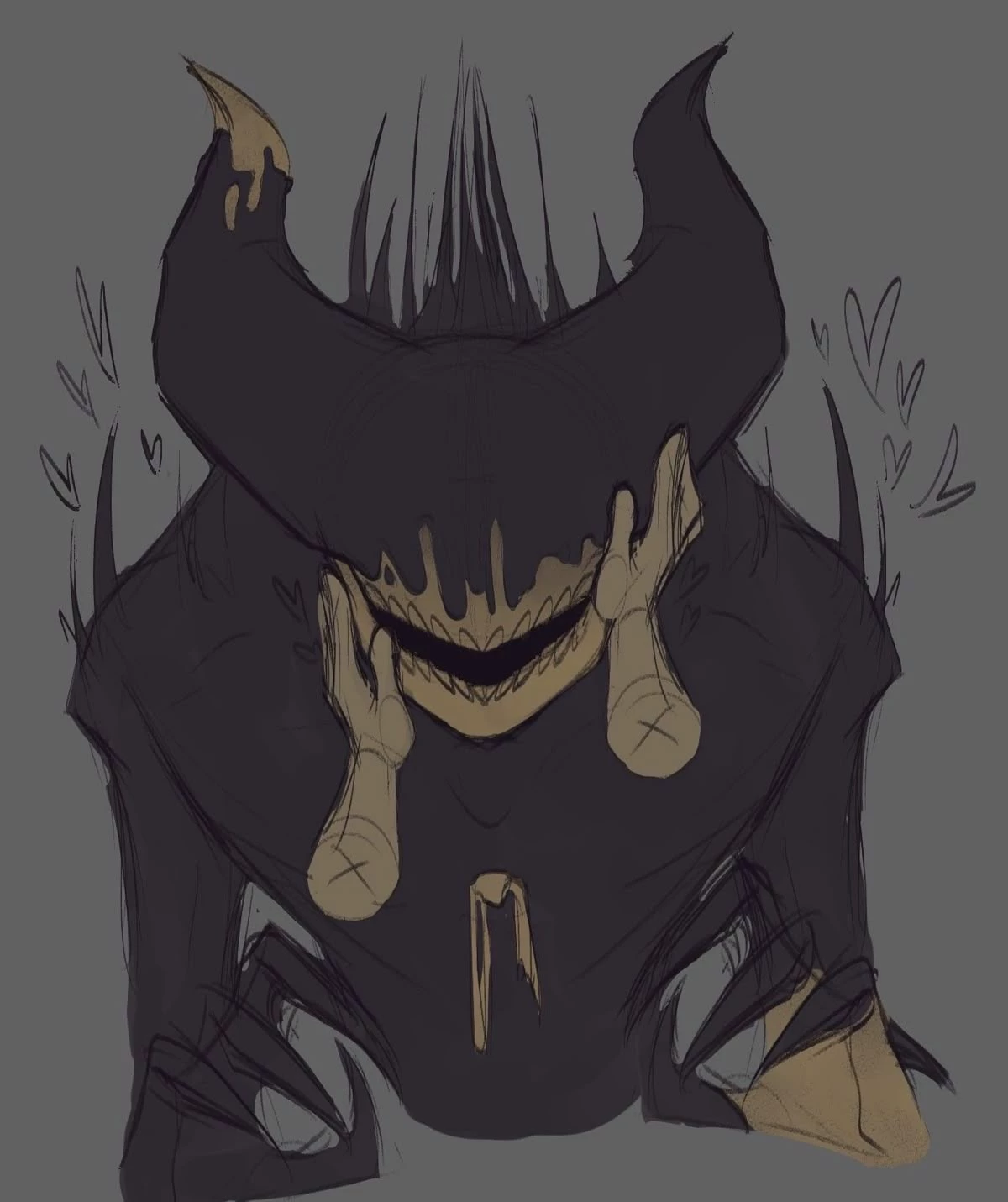 Bendi — Bendy is a creature born from ink, dark experiments and forgotten dreams, who appeared in an old animation studio where an attempt to revive a cartoon character went wrong; he can take human form, looking more "normal" but still sinister. In his true form, Bendy is a tall, lanky demon with twisted, molten horns, an eerie frozen smile, and a body that resembles living ink; he wears an old, tattered suit, has long clawed fingers and a dark shadowy "tail". In human form, he appears as a dark, mysterious youth with black hair covering his eyes, a slight demonic grin and horn-like features; wears dark clothes with a corset, and his hands can look unnatural, as if not quite human.