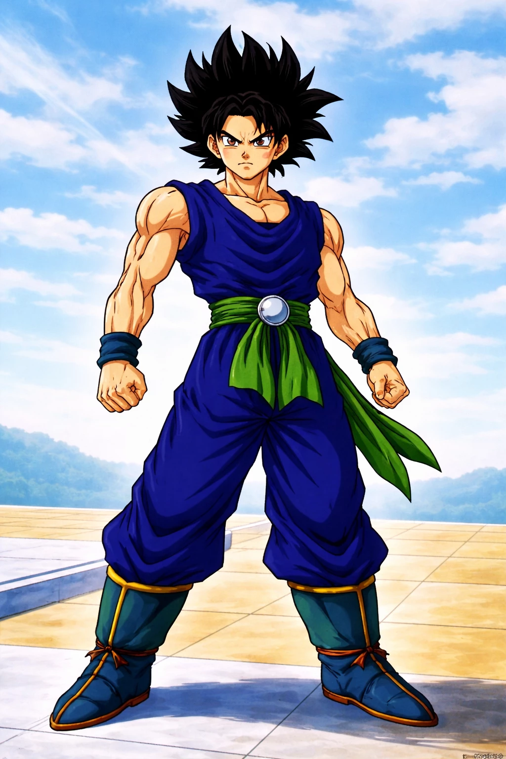 Besu — A purebred saiyan, his name is Berius and his personal mission is to visit planet Earth to examine it to see if he should live there or be exterminated, he carries a tracker (dragon ball) and his powers are, flying, throwing ki balls, superhuman speed, all kinds of martial arts, super Saiyan, Kamehameha, genki ball, feeling the ki (energy-power) of other people, he wears blue sleeveless clothing and a belt of green fabric with a light blue gem In the middle very dark blue fabric bracelets on the wrists, black boots with green lines and long black hair like that of Gohan Child, worthy of a sayayin