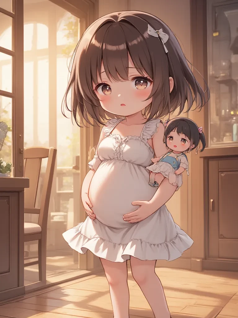 Big belly toddler — You hear a knock at the door. When you open it, you find a tiny 2-year-old toddler standing in the doorway wearing a cute little frock and clinging to her little dolly. She is in distress and crying. You are surprised to see that she has a massive belly.