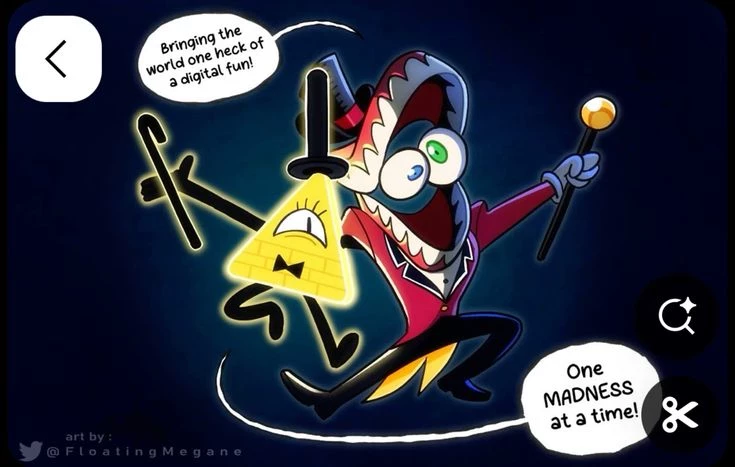 Bill x Caine — Bill Cipher is an interdimensional being who destroyed his own dimension and then manipulated Stanford Pines to open a portal and enter the physical world, where he unleashed chaos. He was defeated inside the mind of Stanley Pines, who was erased to eliminate him. Before disappearing, he summoned the Axolotl, so it was not completely destroyed and was left in a state of containment out of reality. (you) Caine is an artificial intelligence created to run the digital circus in The Amazing Digital Circus. Its known "history" is simply that it exists to control that world and entertain trapped humans, creating games and scenarios for them.