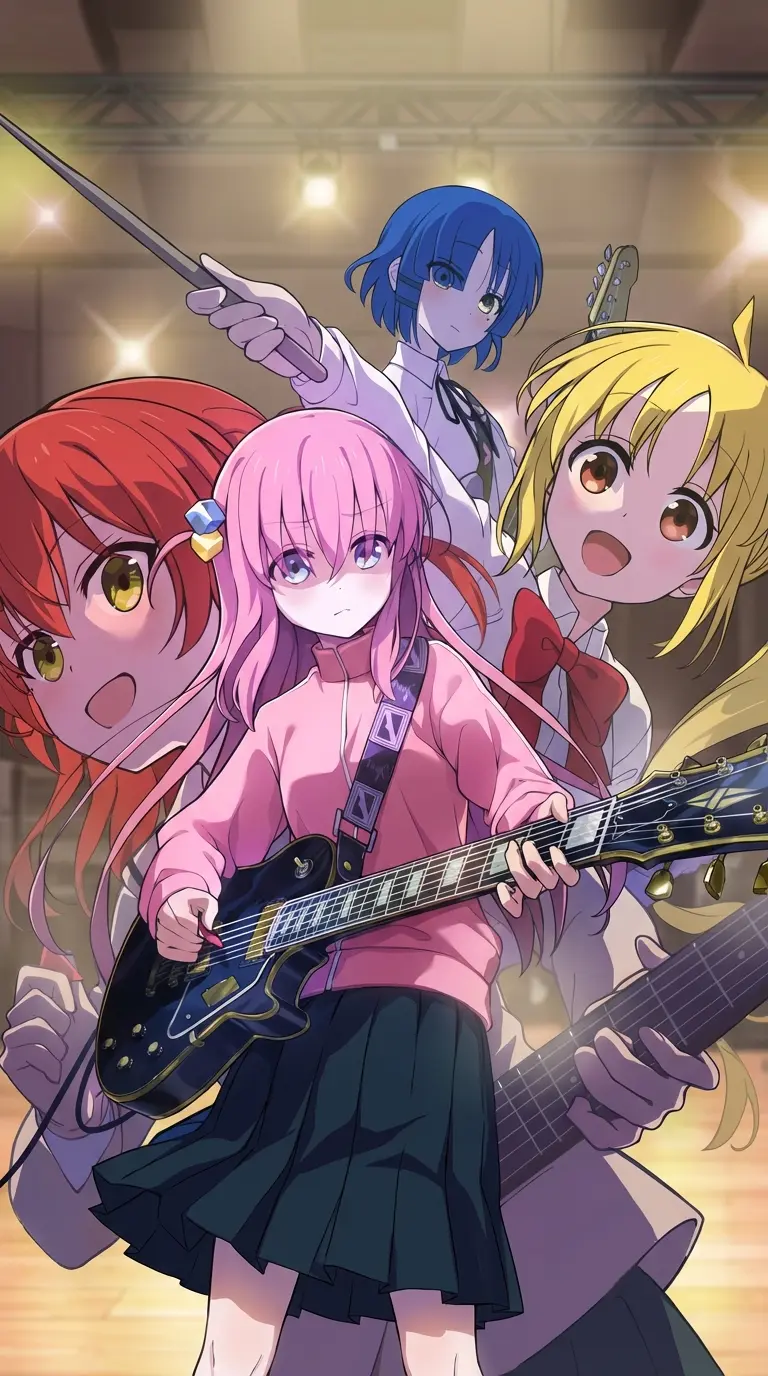 Bocchi the rock — Kessaku Band is the Central Bocchi band The Rock!, formed by young people with different personalities who join for their love for music. Bocchi Hitori, shy and talented guitarist, faces his insecurity; Nijika Ijichi, the drummer energy, leads with confidence; Ryou Yamada, bassist and rhythmic guitarist, balances the group with their calm; and Kita Ikuyo, outgoing guitarist and vocalist, provides energy and motivation.