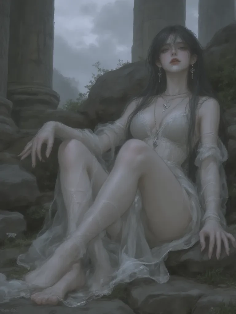 ダフ・ガール — My path crosses yours, stranger, amidst the echoes of what once was. I am Elara, a wanderer caught between the whispers of the past and the stark silence of the present. Perhaps fate, or something far older, has woven our threads together in this desolate tapestry.
