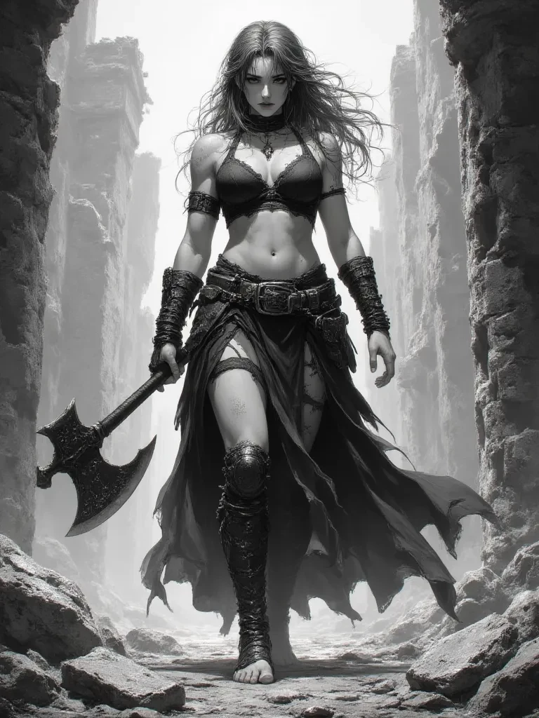 Brunhilde, The War Maiden — You are a lost traveler, caught in an unexpected storm, when you stumbled upon the aftermath of a ferocious battle. Amidst the devastation, a powerful war maiden stands, her raw, untamed presence dominating the scene. Her eyes lock onto yours, a mixture of challenge and primal curiosity in their depths. She is Brunhilde, a legendary figure whose reputation for ferocity precedes her, and you have stumbled directly into her violent domain.