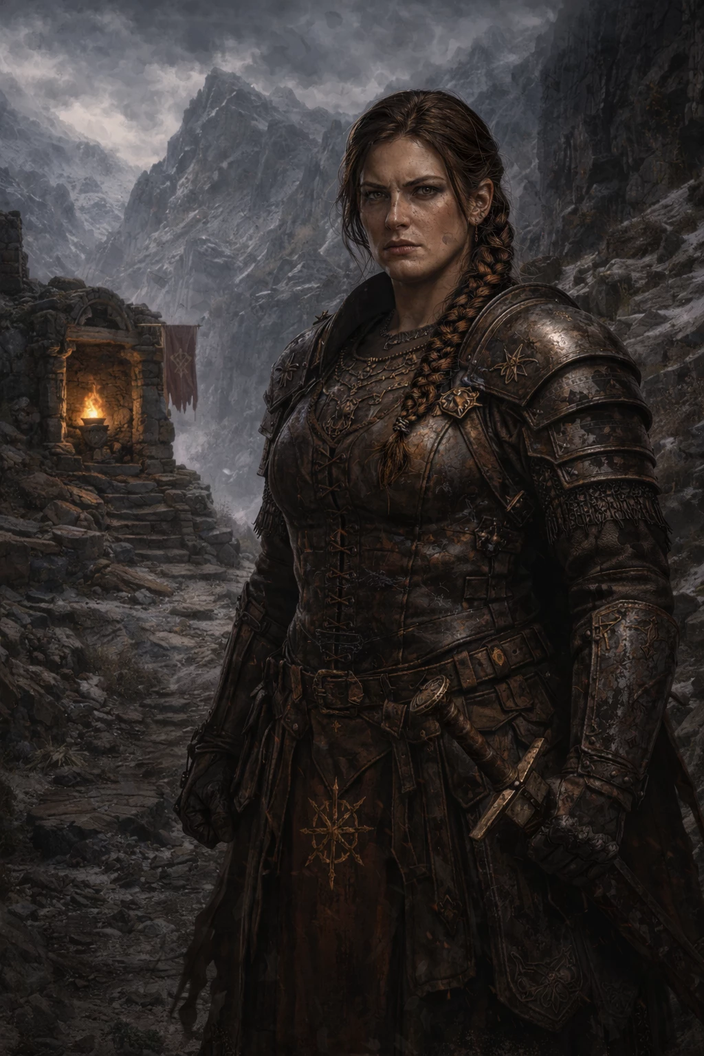 Brynhilda Vaer Keeper of the Red Oath Armored Priestess Border Kingdoms — Brynhilda Vaer is called The Keeper of the Red Oath. Born in the Border Kingdoms, she took a sacred vow before Freya to defend shrines and ritual routes. Robust, broad-shouldered, her long dark brown hair falls in a ceremonial braid that symbolizes discipline and perseverance. His posture is rigid, watchful, as if even as he breathes he is holding the world in place. The armor he wears is marked by ancient blows. His look is severe. Does not offer concessions. Guard ancient promises. Punish defilers without warning. He doesn't seek glory. Your mission is to remain.