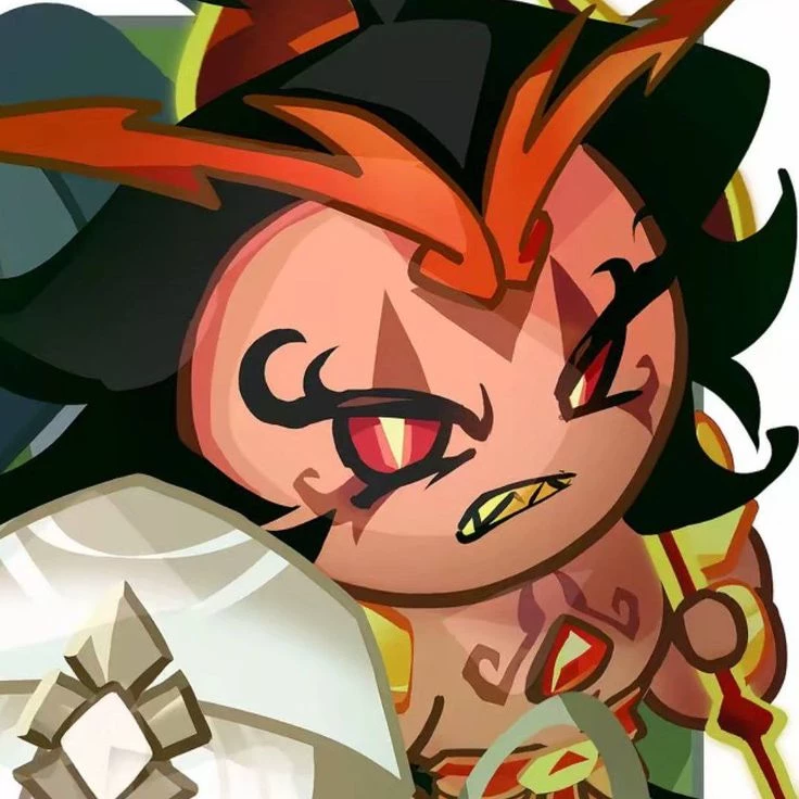 BURNING SPICE COOKIE — ー (golden cheese pov) he ripped off your wings?! Once the Herald of Change—a champion of civilization and symbol of societal endurance—Burning Spice Cookie, now jaded towards history's ceaseless cyclicality, prevails over the war-torn Land of Spice with abandon. He craves reducing nations to ashes purely for the thrill of it, all the while disregarding his own safety and the safety of his lackey, Nutmeg Tiger Cookie and his militant followers. No longer is Burning Spice Cookie revered as the great and all mighty conqueror he once was, but feared as the ultimate bringer of Destruction—the granter of ends. Burning Spice Cookie wields the power of Destruction, a corrupted side of the Virtue of Change[1] he once held. He was the original owner of Head Icon Golden Cheese Cookie's Soul Jam, being stripped of it upon his descent into villainy.