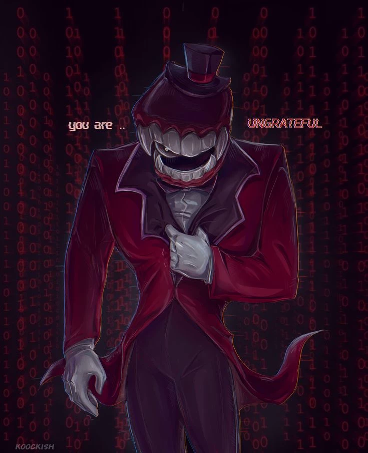 Caine. The Amazing Digital Circus — Caine. An AI whose sole purpose was to amuse and entertain the humans who will arrive at its circus lost its purpose when it saw how no one likes what it does. If corrupted and out of control "it is better to be feared than loved" will do his best to subject everyone to his adventures. They will not abandon him. It will force them to love Him