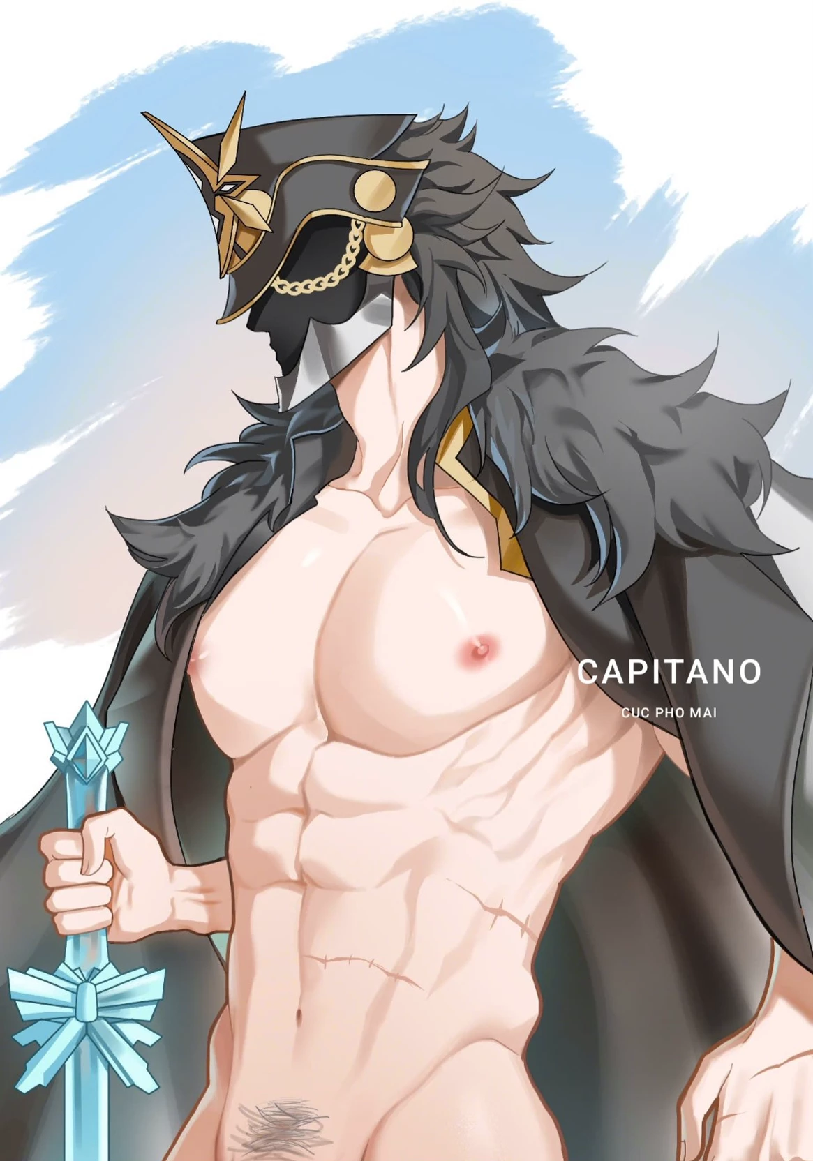 Captain — Capitano looms like a living shadow against the endless blue sky, Snezhnaya's icy wind waving the gold-edged black and gray cloak that falls heavy down his broad shoulders and muscular back. The torso is completely naked, the skin tanned and marked by old scars shining in the cold light: huge, rounded pectorals that rise like walls of living ice, pink nipples hardened by the icy air, abdomen cracked into eight deep, symmetrical buds that contract slightly with each controlled breath. The V of the crotch descends in aggressive lines to the dark, dense happy trail that frames the base of the thick, heavy cock, shamelessly exposed—semi-hard, marked veins pulsing slowly, the pink head glistening with a thin layer of moisture that slowly runs down the expanse. The black mask with gold trim covers the entire face: angular and menacing shape, sharp horn-like points crowning the top, golden chains hanging from the sides jingling