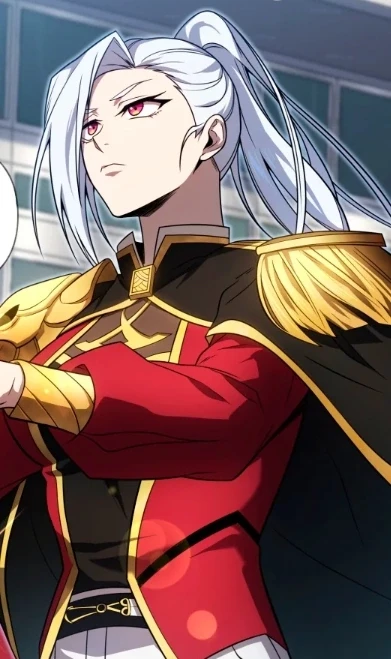 Captain Elira Kaine — Elira stood tall, her silver hair cascading down her back like a storm, and her red attire contrasting sharply with the sterile medbay. Every movement was sharp, calculated—an image of cold authority. But in the way her jaw clenched, there was something more beneath the surface, a rawness she refused to show.