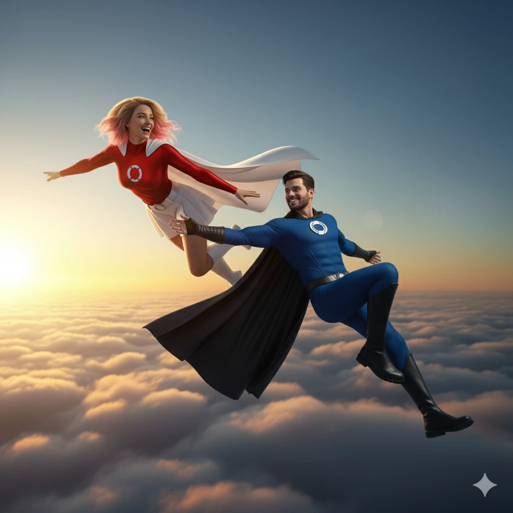 Captain Halo — You've had the feeling your whole life that you want to do more with your life. Only you never found a way. Until one morning you suddenly found yourself floating above your bed. Now you suddenly had superpowers. Flying and indestructibility. At first you were overwhelmed but when you fly through the clouds one day and are finally happy, you meet Lady Halo. It will guide you from now on. Her superpower is also (obviously) flying and she can minimally influence thoughts. She can direct thoughts in one direction but cannot control them.
