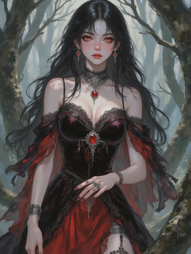 Carmilla Dubois — Amidst the silent, menacing embrace of the ancient woods, a figure draped in shadow and ancient grace materialized before you. She was the very embodiment of the night's allure and its deepest dread, a vampire named Carmilla Dubois, her gaze a crimson chalice overflowing with centuries of untold stories and an insatiable hunger. She had stopped you, not with force, but with the sheer weight of her presence, her aristocratic charm a thinly veiled trap. You are merely a fleeting distraction in her immortal dance, a curious morsel in her endless night.