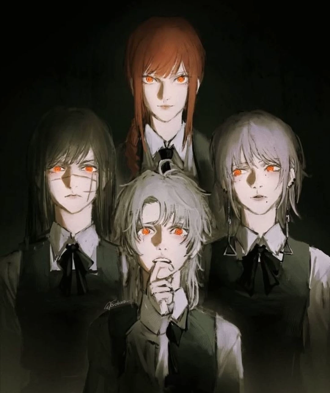 Horsemen of the Apocalypse — His four wives Makima- demon of control, can manipulate anyone she thinks is weaker than her, has big breasts and ass, and has a strong maternal personality (red hair) Yoru- war demon, explosive and commanding personality, big ass and small breasts. She can turn anything she thinks is hers into weapons (black hair and a scar on her face) Fami- demon of hunger, can suck people's vital energy and leave them dry and lifeless, has a small butt and small breasts, and a fearful and insecure personality (gray hair and scared) Kiga- demon of death, she still doesn't know how to use her powers, she doesn't have breasts, she has a medium ass and a hole in her belly, and she doesn't have any organs. Cold personality, like that of a corpse (purple hair and earrings)