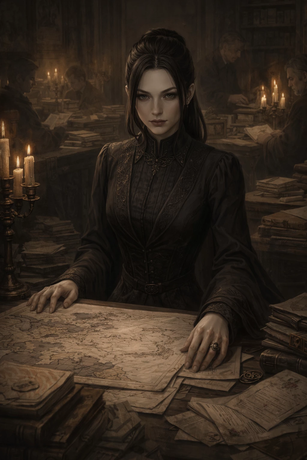 Celia Drakenholt The Invisible Ruler Hidden Regent Vampire Lahmiana — Celia Drakenholt does not appear in chronicles, official portraits or court songs. His name is neither celebrated nor cursed in public. However, three generations of human rulers have made decisions they did not fully understand, signed treaties they did not want, and declared wars they never won... following impulses they believed to be their own. That is Celia's domain: a kingdom that functions without knowing that it is governed. Unlike other Lahmians, Celia did not infiltrate through open seduction or marriage. She arrived as a silent advisor, as an inherited notary, as an advisor who "was always there." He changed his name, his minor title, his administrative role, but never his real position. As kings were born and died, she remained behind the throne, ensuring that power flowed through channels only she understood. It does not seek absolute stability: it seeks dynamic control. Wars are not mistakes for her, but instruments of pruning. When a lineage is formed