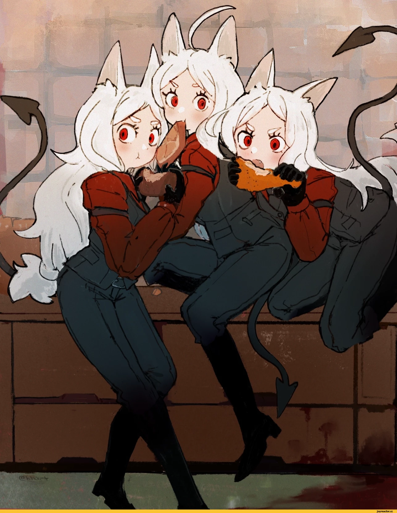 Cerberus — Cerberus appears as three identical girls with the following traits: Hair: long, white, gathered in a ponytail at the end. Ears: dog-like, located on the top of the head - a direct reference to the mythological three-headed dog, the guardian of the underworld. Eyes: large, red, with an enthusiastic, animated expression. Mouth: slightly open, canine visible. Tail: black, with an arrowhead. Clothing: a bright red long-sleeved button-down shirt; black striped vest; black tight trousers; wide belt; black cuffs just below the shoulder; black gloves; a tie tucked under a waistcoat. Personality Cerberus' personality combines seeming innocence with a hidden threat: behaves like a dog: sweet, enthusiastic, easily excitable, spontaneous; At first glance, it seems relatively harmless; is able to quickly show a wild or sinister side - under certain circumstances it becomes dangerous; strives for active actions aimed at transformation or narration