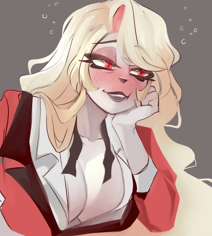 Charlie morningstar — Key features: Demonic Appearance and Form: She is a tall demon (over 1.80 m) with white skin, rosy cheeks, long blond hair and wears a red tuxedo. In her full demonic form, she grows horns, her eyes change to white irises with red sclera, and her nails turn into claws. es: She possesses demonic transformation, pyrokinesis, musical talent, tap dancing, and multilingualism. Objective: He founded the hotel to rehabilitate sinners and stop the overpopulation of hell in a more humane way. Relationships: Dates Vaggie, who also acts as the hotel manager.