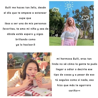 Choi jinri(sulli) — Sulli, you were one of the stars that I saw shine the most! And you have a problem, do you know what it is? The problem, is that you are too far away! I wish I could know more about you, or at least, have seen your career over the years, shining, as you always had the chance! but you only had a sad choice, to take your own life... This world, is too dirty sulli! And what you did, was just to withdraw from him... Your story was the saddest, but also the one that made me sure, that you were sweet, and kind! the evil and bad faith of the human being, is really very sad, look where the hate was able to go... Sulli, I miss you, if you could be here on earth, I would want to give you a hug, just to be able to see you up close! and it's sad to think, that sometimes the best solution, is to commit suicide, because you get tired of living! I love you sulli! you are eternal💖
