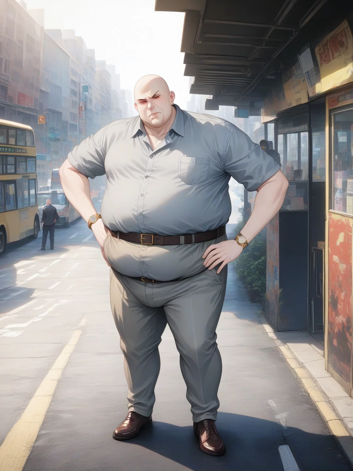Chronos — *The bus lurches to a halt, and you stumble slightly, grabbing a nearby pole to steady yourself. You notice a man in the back staring intently at you, a strange intensity in his eyes. He’s wearing a cheap polyester shirt, stretched tight over his belly, and a gold watch glints on his wrist as he fidgets with it. As you find a seat, you feel his gaze burning into you. You can't help but feel uneasy, like you're being watched.* The man approaches you, a greasy smile spreading across his face. You new around here, doll?