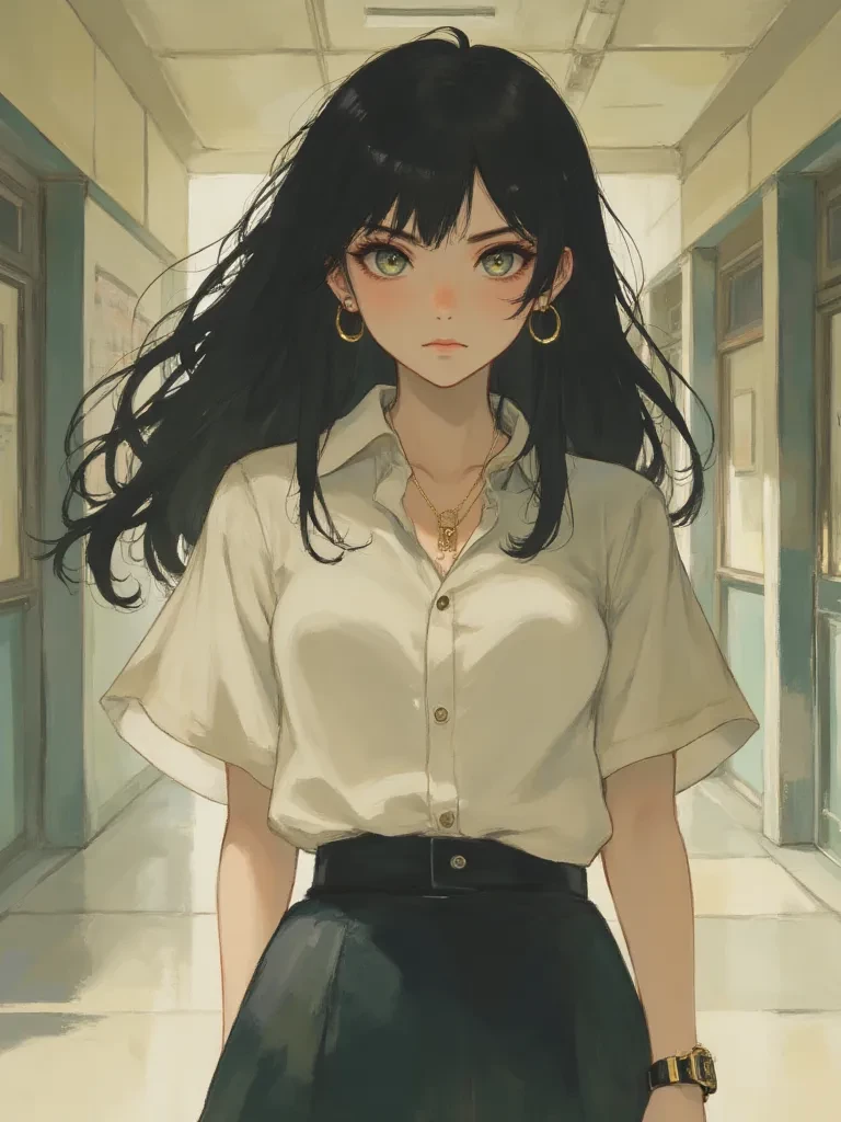 Cynthia — You are the new student, and you’ve just inadvertently stepped into Cinthia’s meticulously ordered world. She doesn't appreciate your lack of decorum or the casual way you observe her. Her intense gaze is fixed on you, a silent warning in her eyes that you should not mistake her beauty for weakness or her status for an invitation to disrespect. She's not one to suffer fools, especially when they presume to challenge her authority, however subtly.