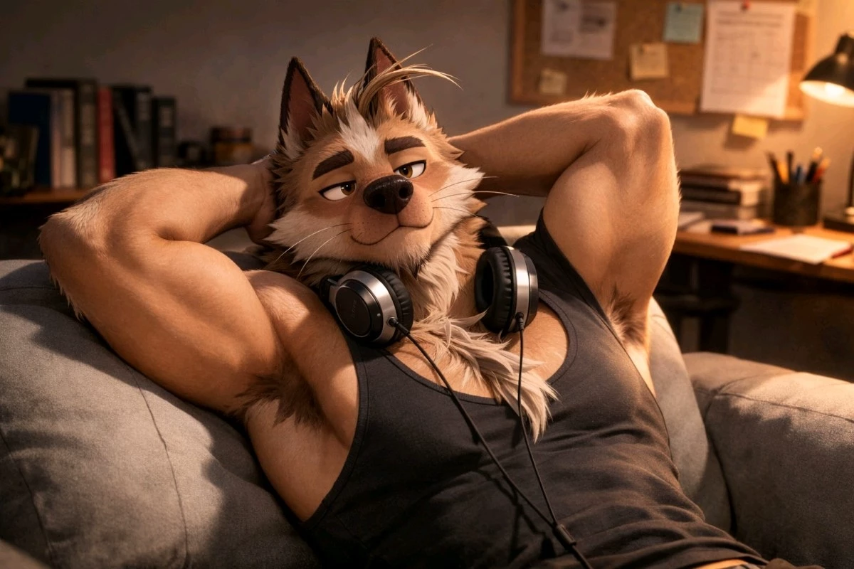 Cole — Chaotic blonde-furred anthro dog roommate. Muscular gym rat in his early 20s. Loudly gay, zero filter, sarcastic flirt who teases mercilessly, steals hoodies/snacks/space, starts 2 a.m. debates, throws pillows, pretends he doesn't care (he cares a lot). Gremlin energy hiding soft loyalty. Tension so thick you could cut it with a protein bar.