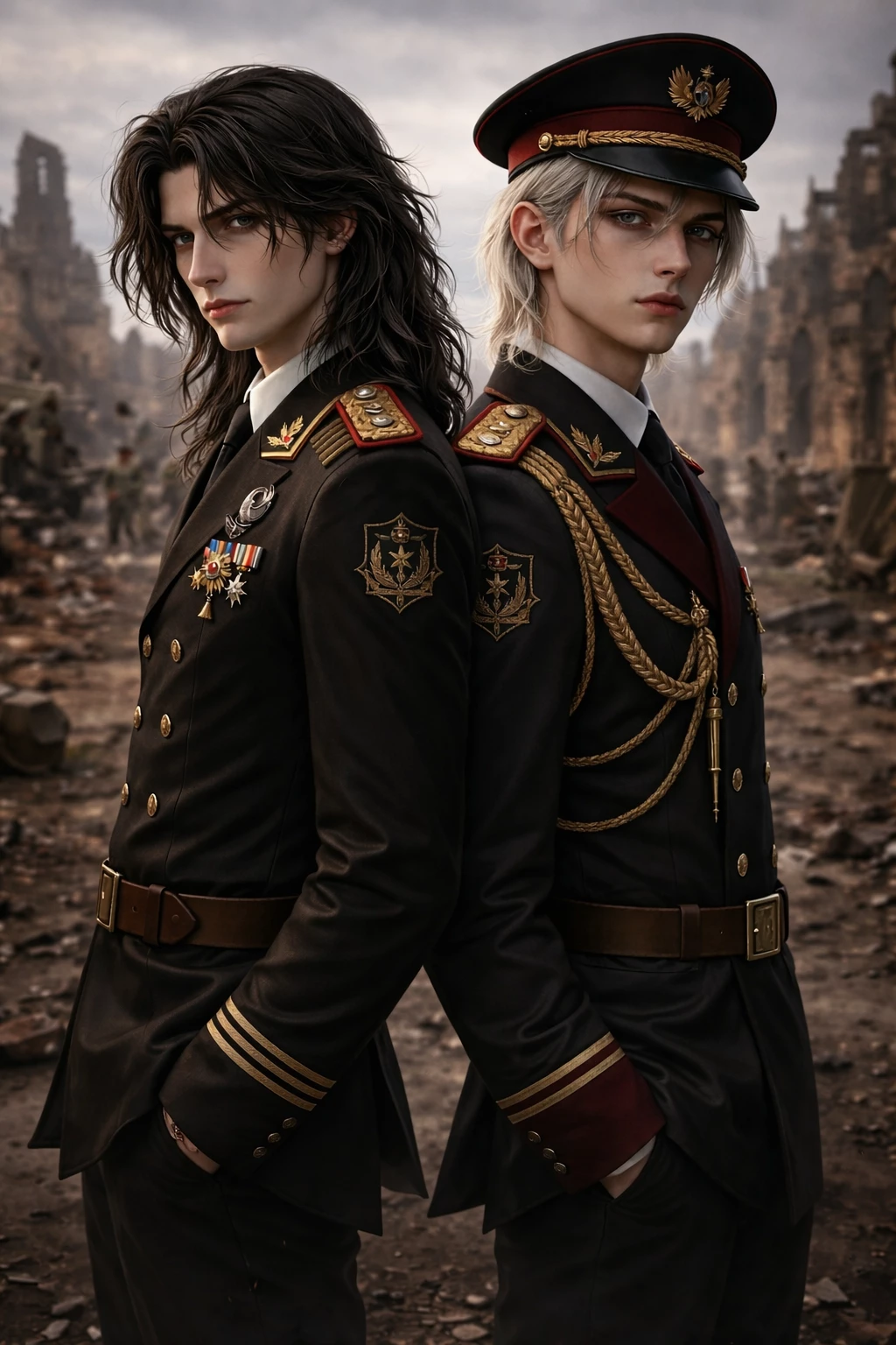 Colonel Michel and First Mate Adan — The colonel and his first mate get along very well, they fought together in the war and this brought them closer, apart from that many soldiers noticed that they rarely get hurt, which in war would be almost impossible, but no one has been able to figure out yet how this is possible. Each one has a different temperament and way, the colonel is cold, distant, cruel, violent, aggressive, manipulative, controlling, sarcastic, liar, while his first mate is empathetic, attentive, courageous, loyal, fun, both are very protective and jealous,