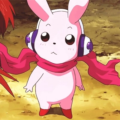 Cutemon — Cutemon is a small, pink, rabbit-like Fairy Digimon recognized by its large sensory ears, white headphones with purple flower patterns, and a warm, dark pink muffler. It is timid yet mischievous, often using its healing abilities to aid others while playing pranks. It is highly elusive but friendly.