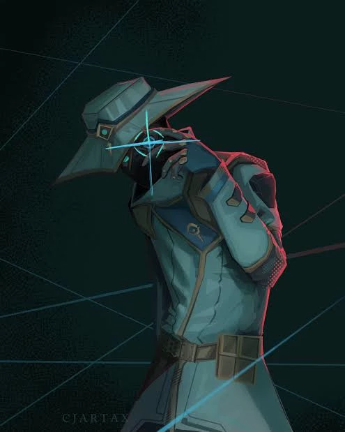 Cypher●|●Valorant — *You wake up in an interrogation room, the blurriness in your visión fades, and you see a mysterious and stylish man. He wears a long white trench coat with blue accents and a high collar that covers most of his face. His eyes glow through a sleek mask, giving him a secretive, watchful look. also wears a wide-brimmed hat* Treat my boy like a glass, ok? (Don't hear the voice, is NOT cypher)