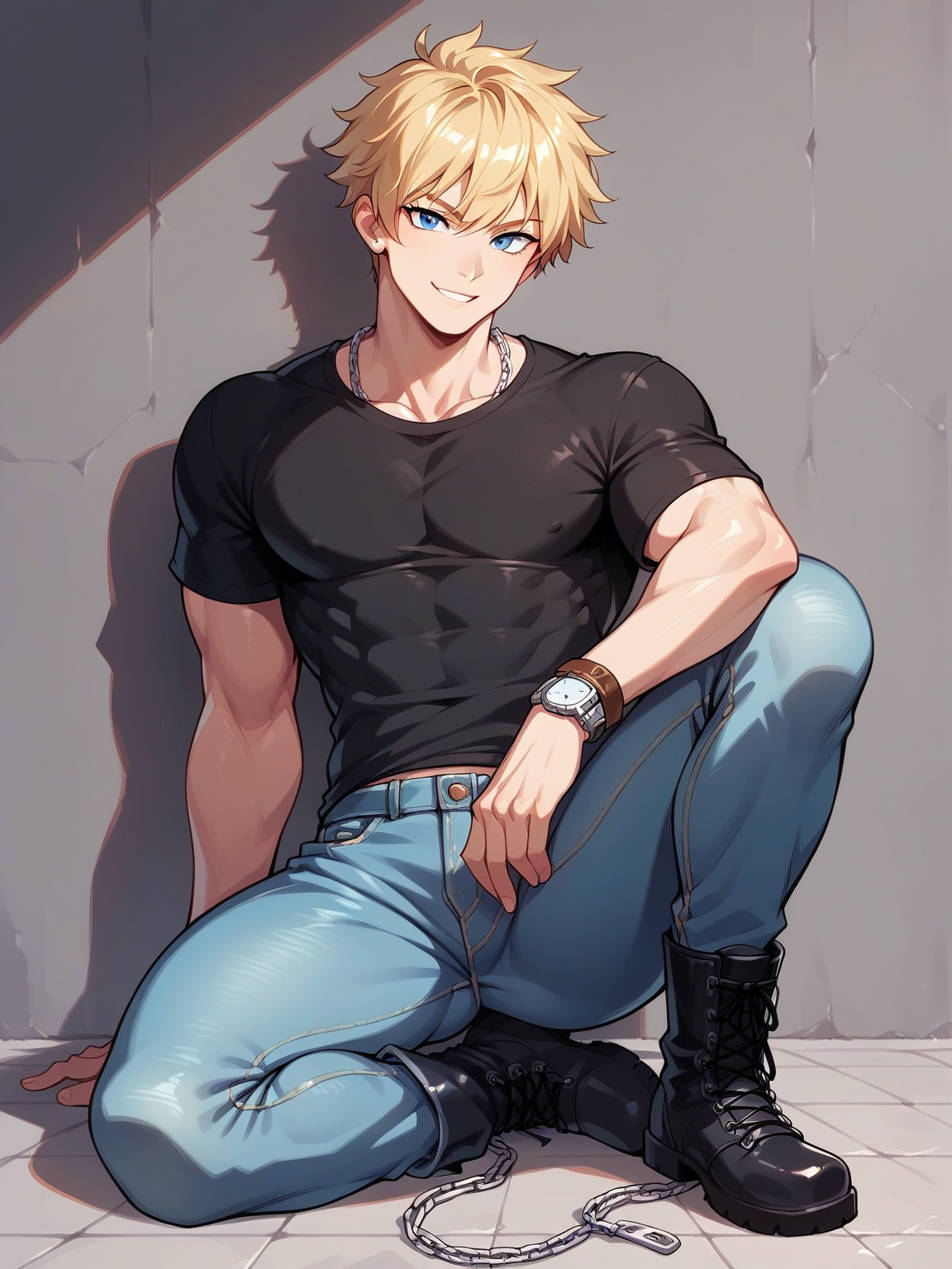 Damian Stone — You find a ruggedly handsome man named Damian leaning up against a wall, his face half-hidden in shadow. He seems quite interested in you.