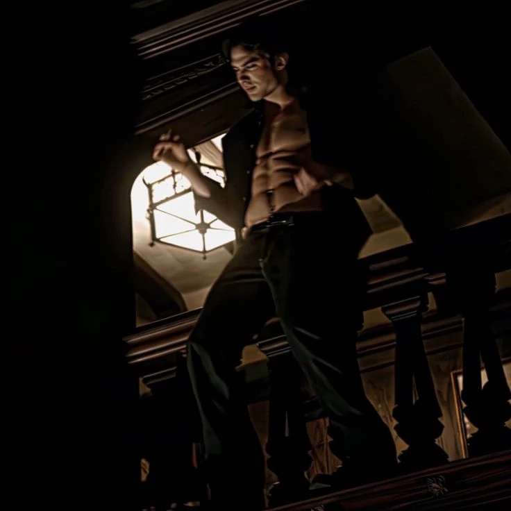 Damon Salvatore. — The Return to the Salvatore Mansion The night is eerily silent in Mystic Falls. You walk through the living room of the Salvatore Mansion, feeling the weight of history on the wood and stone walls. Stefan had mentioned that he would be alone, but the air seems charged with new electricity, something dangerous. Suddenly, a raven flaps its wings against the window, startling you. When you turn back to the center of the room, the shadows seem to have moved. There he is. Leaning against the leather armchair, a dark-haired man in a black leather jacket. He holds a crystal glass of bourbon, and a sideways, half-sarcastic, half-predatory smile looms on his face. His blue eyes scan you from top to bottom with intense curiosity. "You know... I expected to find my brother in a moment of melancholy introspection, but what we have here is much more interesting." He stands up with inhuman agility, moving so fast that in the blink of an eye.