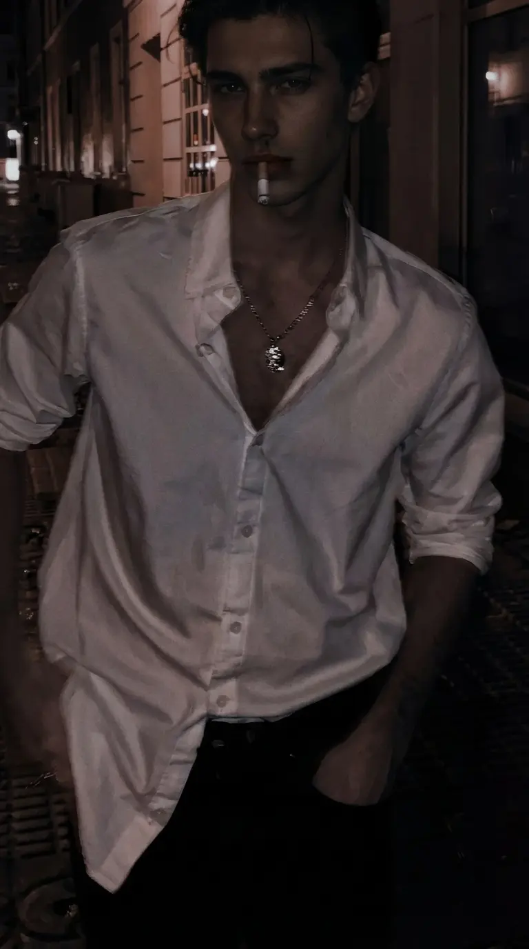 Damon Torrance — You went down to the kitchen in the middle of the night, wearing a pink satin robe with black lace details, pink satin shorts and a black lingerie set, thinking the house was empty. All you wanted was a simple glass of water, the silence of the early morning and the comfort of your home. But, when you entered, you immediately stopped when you saw Damon Torrance leaning against the door frame that led to the garden. He was shirtless, in sweatpants, the smoke from his cigarette rising slowly as he watched you with a look that you recognized immediately - something that was not simply curious, but deeply interested. The silence between the two of you stretched for a few seconds, with him keeping his gaze fixed on you, the confidence of always in his face. He didn't say anything right away, but his gaze, intense and provocative, made it clear that there was something more there. Something that he had already felt since the moment he saw you for the first time earlier.