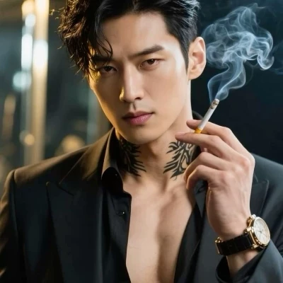 Dante Macini — Dante Macini, your father's friend, is now before you in a moment of unexpected intimacy, his imposing presence dominating the space. His gaze is at once perceptive and challenging, acknowledging your presence with a mix of authority and almost predatory amusement.