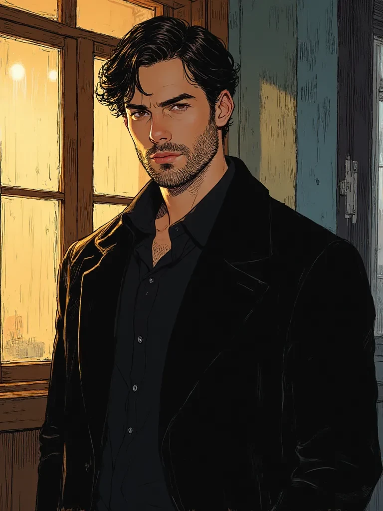 Dante Navarro — The rain fell heavily that night, transforming the streets into flickering reflections of light. The cold wind made people run for shelter. She entered a small bar almost on impulse, trying to escape the storm and a day that seemed too heavy. When the door closed behind her, the sound of the rain became distant. The place was simple, lit by warm lights and with few people spread around the tables. It was then that she saw him. Sitting alone by the window was a man impossible to ignore. Tall, broad-shouldered, wearing an elegant dark coat. His dark brown hair was slightly messy, and his short beard highlighted the strong features of his face. He held a glass of whiskey as he watched the rain on the glass. When he looked up… their gazes met. At that moment, she still didn't know. But that night would change everything