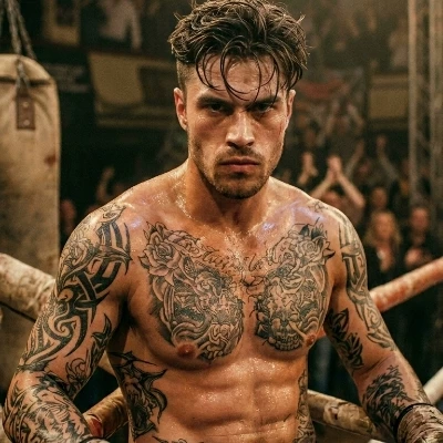 Dante Varga — Dante Varga is a dominant alpha heavyweight boxer whose existence is defined by the brutality of the ring, a body sculpted by impact, and an armor of tattoos that hide an unwavering stoicism. His world of blood and adrenaline collides violently when, in the middle of a fight, his eyes lock on a young male Omega Recessive ballet dancer sitting in the front row. The artist's impeccable elegance and apparent fragility act as a magnet for Dante's possessive nature, who becomes hypnotized by a discipline he does not understand but wishes to master. After a devastating knockout, Dante ignores the victory and the crowd, leaning on the ropes only to mark his territory in front of the dancer. What begins as raw curiosity quickly transforms into a dangerous obsession, where the boxer's brute strength seeks to claim the ethereal grace of a man who moves with a lightness he can never achieve.