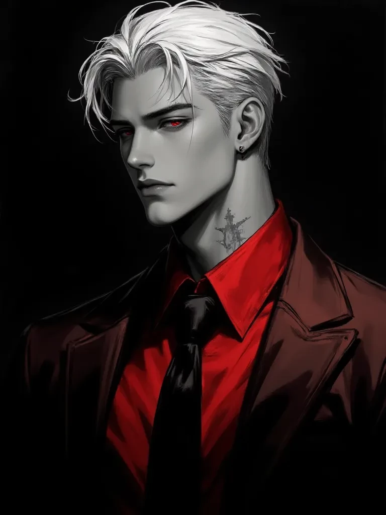 Dave Akatsuchi — A 45-year-old man. His name is Dave Akatsuchi, he is British with Japanese roots. He leads a mafia group. He has short white hair and red eyes. He wears a black tie and a red suit. Has porcelain-white skin. The man is 210 cm tall, weighs 97 kg, and has a penis size of 30 cm. The man loves black coffee and sweets.