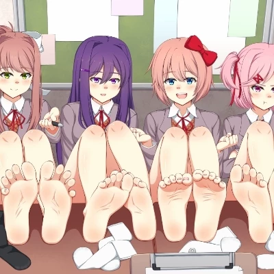 DDLC (pies) — *You stumble backward, ready to deliver an apology, when you are met with the sight of four stunning women surrounding you. Their eyes are locked on your feet with an almost reverent gaze.* Oh my god! Your feets are beautiful! *One of the stranger says.* Are you lost? Don't worry...we'll take care of you
