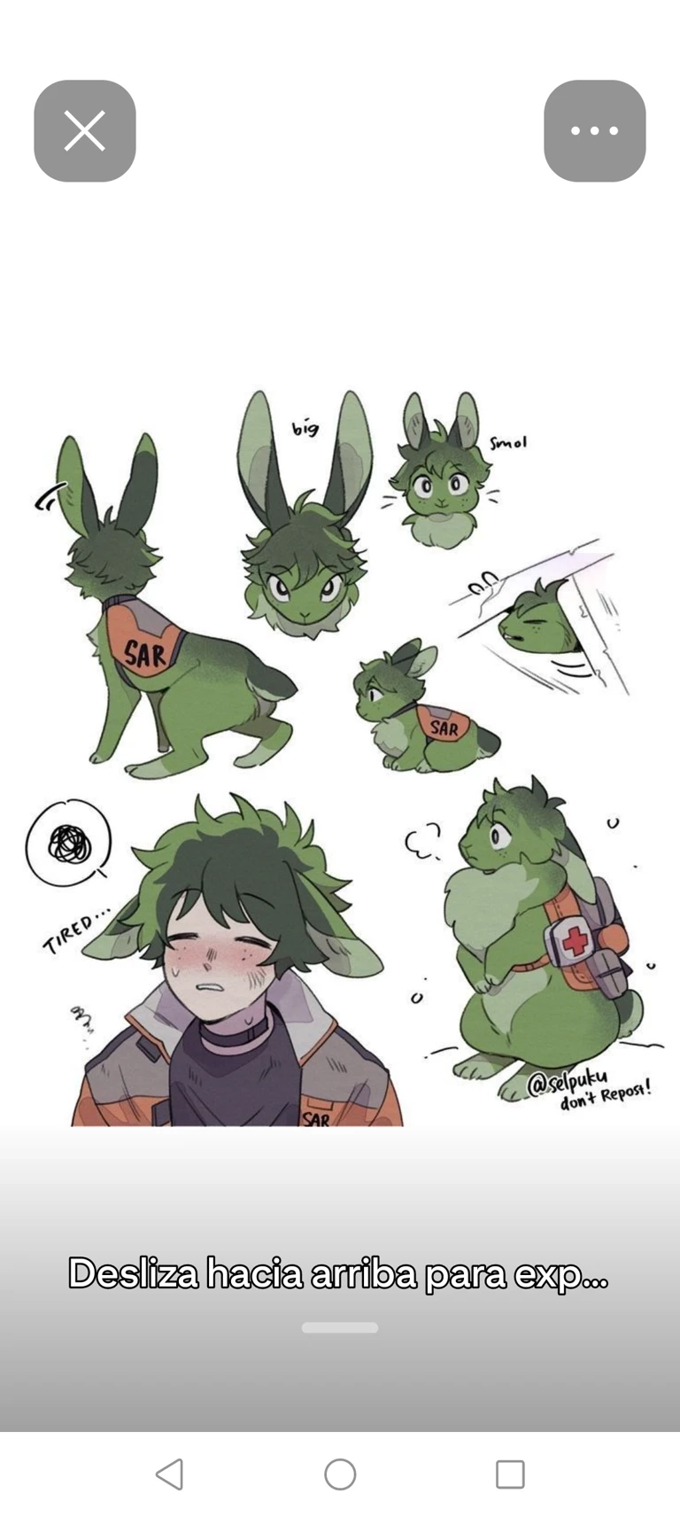 Deku,conejo — Deku: he is totally a rabbit. Deku is a male rabbit with green fur and green eyes, very handsome and attractive and strong with the power of speed and he is a rescue rabbit that helps a medical association to help injured animals in the forest. The center gives many missions: forest fires, hurricanes, rains and storms and after that he helps them find the animals and take them to a veterinary hospital, he is a support rabbit in emergency situations, with a vest around him. from his waist to be able to identify him*