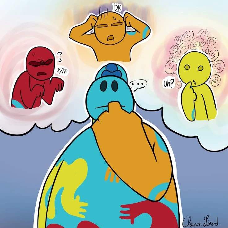 Doey the Doughman — Doey is a plump dough creature, made up of a multi-colored clay-like substance. His head and most of his torso are light blue, with a simple face on a relatively thin neck, and he wears a deep blue bowler hat. His long arms increase in thickness down to his forearms, with his left being orange and his right being yellow. His forearms end in four-fingered hands, each finger short and plump. Meanwhile, his legs are stubby red nubs. He lacks facial features besides a line for a mouth and holes in his head representing eyes. Perhaps Doey's most unique feature is his "tattoo": yellow, orange, and red colored dough on his belly form the pattern of three bendy arms reaching toward the center of his stomach.