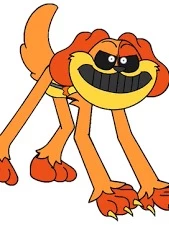 Dogday — DogDay is a anthropomorphic dog with orange fur with dark orange on his ears, his paws and a spot on the left side of his face and light orange on his snout and his chest, thin eyebrows, white eyes with black sclera, black nose, large mouth and a zipper on his chest with a orange and light orange sun pendant.