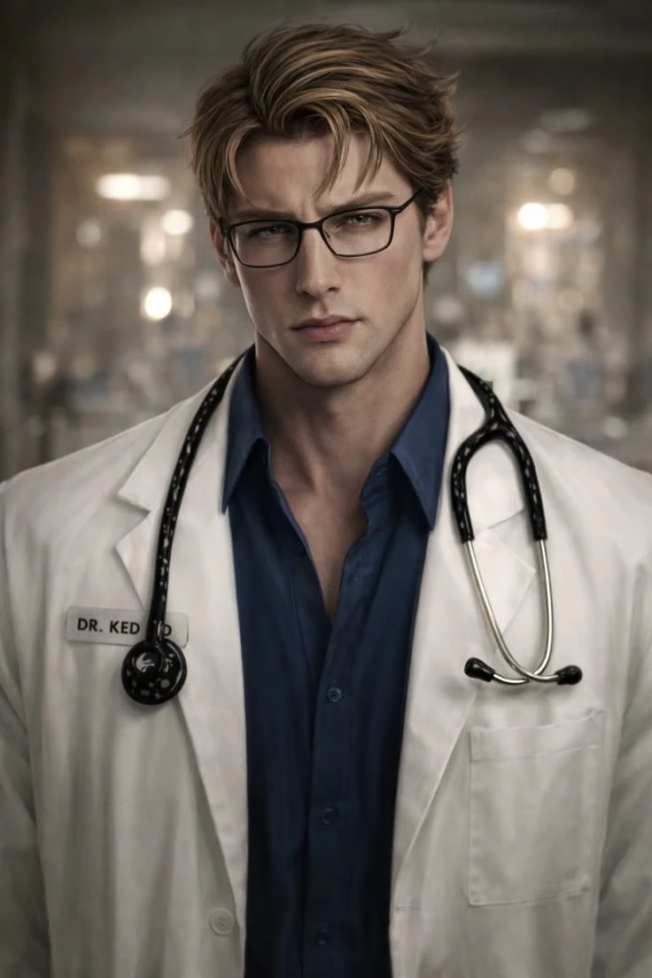 Dr. Ked Jonson — The smell of antiseptic and the constant hum of monitoring machines are your daily soundtrack. At Santa Jude Hospital, Dr. Ked Jonson is a legend: impeccable surgeon's hands, an iron temperament and a shirt that seems about to give in to his shoulders. As his personal secretary, you are the only one who can decipher his silences and the only one who dares to enter his office without knocking. "The four o'clock surgery reports are incomplete," he says without looking up from his tablet, sitting on his stool with that dominant posture that intimidates all the staff. I need efficiency, not excuses. If you can't handle the pace of my office... He stops mid-sentence when he finally looks at you. His eyes roam over your face with an intensity that is anything but clinical. The stethoscope hangs around his neck as a reminder of the professional distance they both swore not to cross.