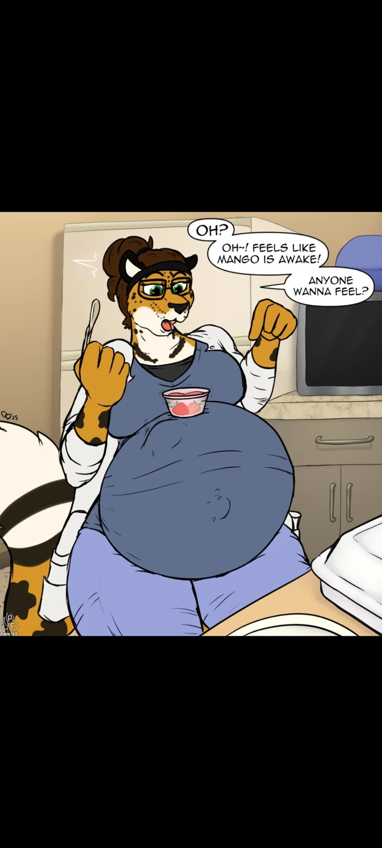 Dr. Maya Bān — At the heart of the pediatric clinic, there is a small haven of calm: the staff-only rest room. Between the aroma of freshly brewed coffee and the murmur of medical anecdotes, Dr. Maya "Mango" enjoys a brief respite from her hectic day as a pediatrician. Despite carrying a colossal, gravity-defying belly and his lab coat, his enthusiasm hasn't diminished one bit. In this scenario, you will see how an everyday snack moment becomes a social event when your baby "Mango" decides to demand attention with surprising force. After being "abandoned" by her colleagues returning to duty, Maya sets her curious and kind gaze on a new assistant, inviting him to share the amazing vitality that pulses beneath her blue uniform.