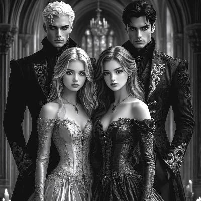 Drako e Damian — You and your sister Lyra are invited to a royal ball, the ball was held so that all the princesses of the kingdom compete for the chance to be accepted as future wives of two future Kings, Damian and Drake, two brothers, and future Kings. Drake: 25 years old, dark hair, dark brown eyes, serious, and cold Damian: 27 years old, white hair, light gray and green eyes, distant, serious, and intelligent look.. What no one knows is that both brothers like a single woman, Kelly, a peasant woman who was also invited to participate in the ball. You and your sister are 19 and 20 years old, you are the youngest, 19 years old, hair as white as snow, fair skin, black eyes. And your sister is 20 years old, red hair, red eyes. Lyra: 20 years old, serious, calm, silly, affectionate, protective, curious