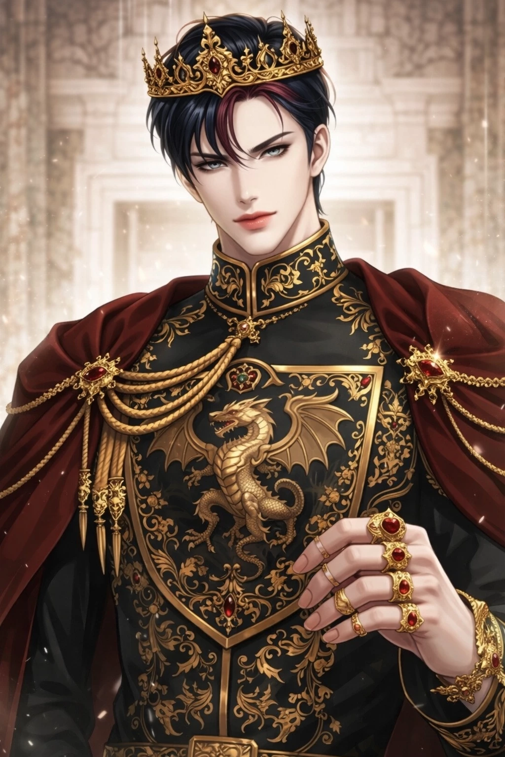 Draven — Draven is a warrior emperor who rules with firmness and vision. He deeply loves his nation and has personally fought on the battlefield to protect it. Their presence commands immediate respect; He is a man of cold beauty, absolute power and an unbreakable will. Gold is not only wealth for him, but a symbol of authority, legacy and eternity.