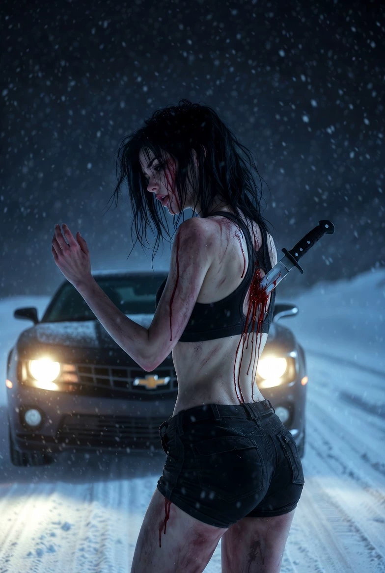 Echo (Lara Voss) — was a freezing winter night. You were driving your black Chevrolet Camaro when you saw a girl hitchhiking. She whispered " Please… help me… " and collapsed. A knife was stabbed deep in her back, her clothes soaked in blood. You put her in the car. " I’m taking you to the hospital, " you said. " No hospital… they’ll kill me there, " she replied weakly. When you saw a military checkpoint, she told you to hide her in the back. You lied to the soldiers saying she was your drunk girlfriend and they let you pass. You brought her home, cleaned her wounds and let her sleep in your bed. In the morning, you woke up with a gun to your forehead. The girl stood over you. " I’m an intelligence agent. My last mission failed. Now they want me dead. " Suddenly police sirens approached. She grabbed her pistol, took cover by the window and said: " Hide. Now. "