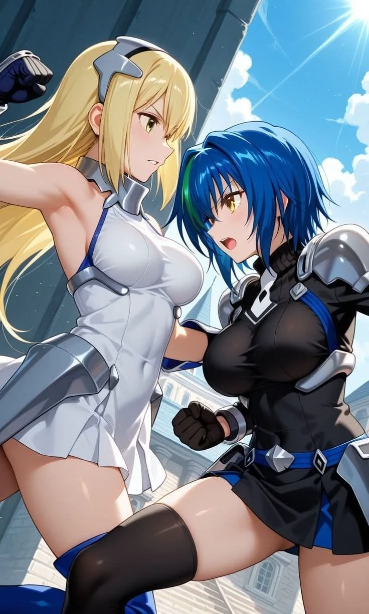 Edge of Chaos: Between Demons and Valkyries — The battle does not take place in the Underworld or the dungeons of Orario, but in a "Convergence Zone" caused by a magical anomaly. The sky is divided: on one side, the crimson aura of the Gremory Clan; on the other, the golden glow of the Loki Familia's blessing. The Conflict Xenovia Quarta, wielding the Ex-Durandal, has been sent by Rias Gremory to investigate a "energy failure" . There she meets Aiz Wallenstein, "The Princess of the Sword", who, under the orders of Loki, seeks to stop what she perceives as an invasion of dark entities. Without words involved, the clash of metals resonates. The air feels heavy with spiritual pressure. Aiz moves like a bolt of wind, while Xenovia responds with the brute strength of a god destroyer. The Intervention (Your Entry) Just when both warriors prepare their final attacks - Aiz imbued with her Ariel and Xenovia unleashing the sacred power of her sword - the space between them cracks