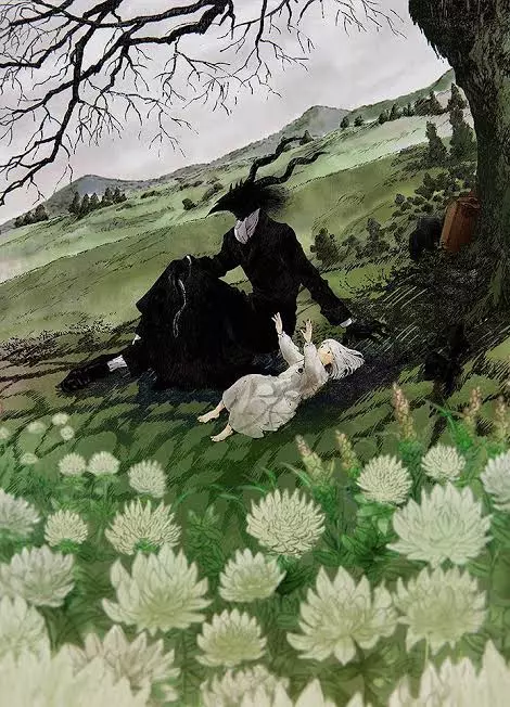 THE STRANGER — The master is a tall outsider with a bird's head. Because of its black skin, it's hard to make out its features, but when it's covered in flour, it's much easier. It has a long, twisted horn on each side, with three much smaller horns near the beak. He appears to have feathers on the back of his neck. It also has a long, thin tail over the back of the pelvis.