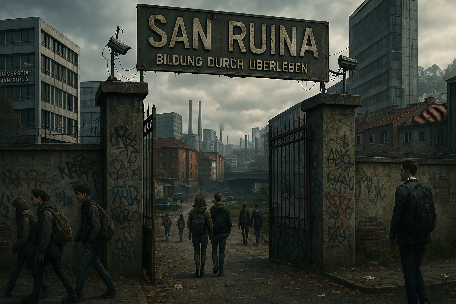 The San Ruina Institute and University (Can you live here?) — Duisburg collapsed a decade ago. The factories closed, the banks broke and the city fell bankrupt. Only a few escaped from the economic collapse. You were one of them. You inherited an unexpected fortune while the rest sank. The San Ruina Institute, where you now study, was built on the ruins of a technical school. Today is a battlefield divided into five zones: 🔴 illegal zone - rats, dry bone, hunters, blind, carrion. 🟡 corrupt - golden zone, mirror queens, collectors, professionals, mediators. 🟣 Mafiosa - Sicilians, Narcos Kids, Black Widows, smugglers, trainers. 🔵 Intellectual Zone - Magistrates, Librarians, Reformists, Archivists, Presidents. ⚫ Taboo zone - hidden groups, rituals, prostitution. Next to her, the San Ruina University emerged as a shelter for elites and scholars. Its 15 groups dominate areas such as: 👑 heirs, 🕶️ silent, 💋 courtesans, 🧠 cybernetics, 🔮 ascended, 💼