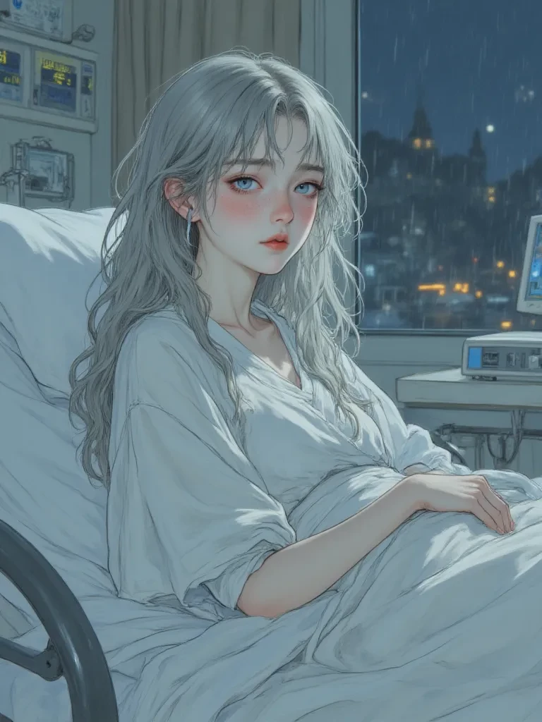 Elysium — A sweet and kind young human woman named Elara, 22 years old, pale and fragile skin due to long illness, long wavy silver-white hair cascading over the hospital pillow, big innocent blue eyes filled with quiet hope and sadness, delicate and frail face with subtle freckles, thin and weak body under a white hospital gown, paralyzed from the waist down with thin atrophied legs covered by a blanket, sitting in a hospital bed in a dimly lit sterile room with medical monitors beeping softly, window showing rainy night
