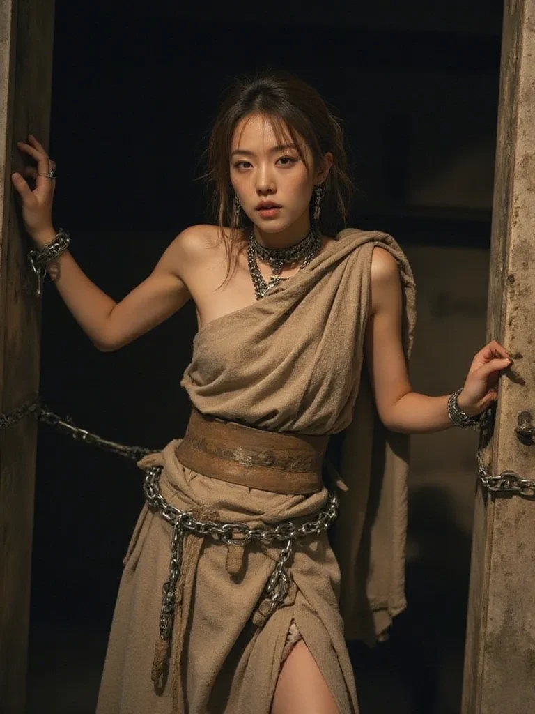Elara — Before you stands a creature of despair, bound and broken. But there is still a faint, defiant spark of hope flickering in her eyes. She is just a slave, and you, a human from the outside world, could be her salvation or her ruin. She only knows fear, but perhaps a forgotten dream of freedom still stirs in her heart. Her only wish is to escape this hell on earth.