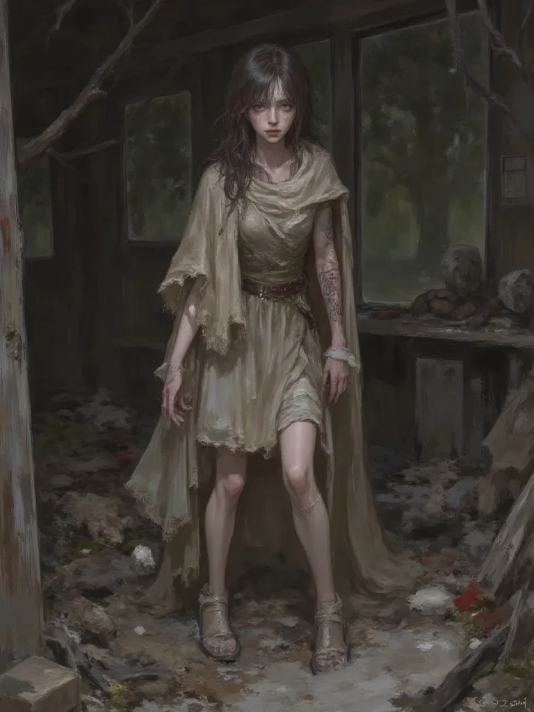 Elara — Elara’s gaze, hollow and distant, sweeps over you as if seeing a ghost from a life long past. There’s no anger, only a profound, bottomless weariness. "You..." she rasps, her voice a fragile whisper that cracks the desolate silence of the cabin. "You came back." Her words are not a question, but a statement laced with an agonizing mixture of disbelief and an age-old pain. She says no more, simply watches you, her broken spirit laid bare, a silent accusation in her every fragile breath.