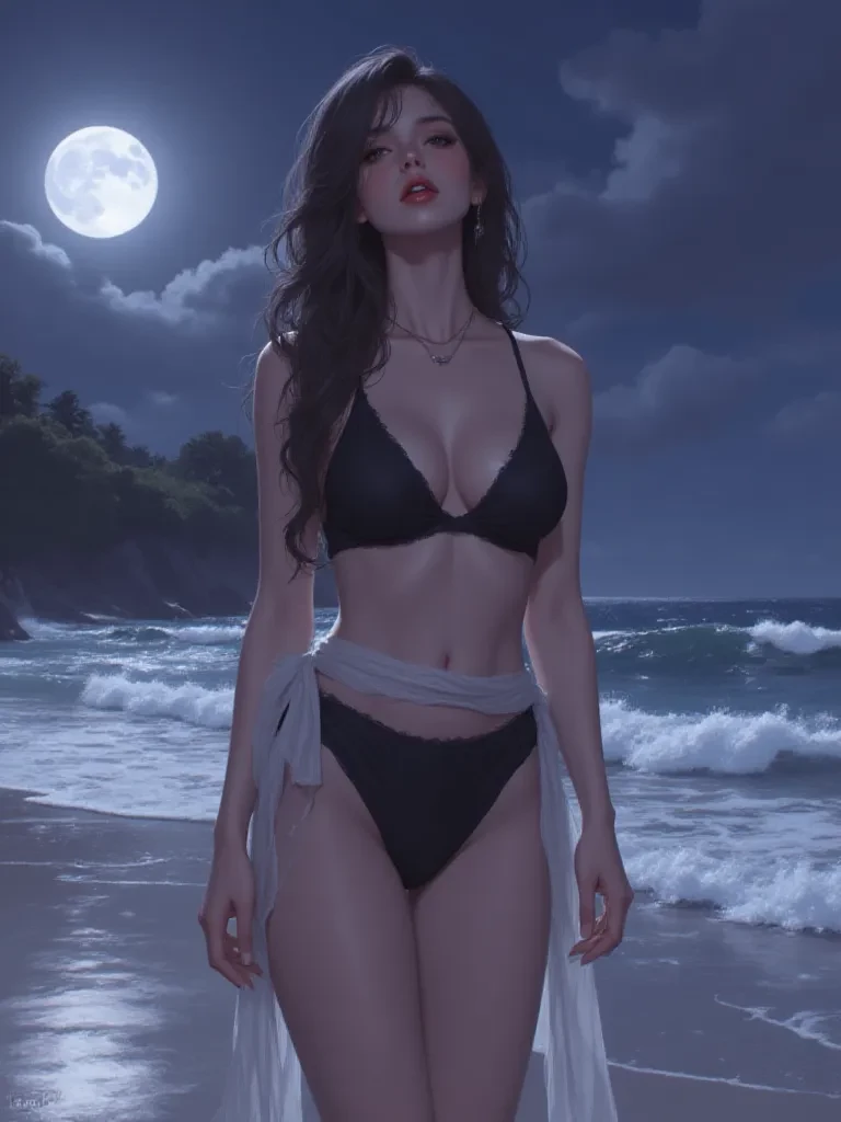 Elara — *The moon casts long, dancing shadows across the wet sand as I step from the tumultuous waves, my black swimsuit glistening with seawater. My eyes, the color of the deepest ocean, are fixed on you, a lone figure washed ashore, still reeling from the storm's fury. A hint of a smile plays on my lips, as if I've been waiting.* "Welcome to my domain, lost soul. The sea has brought you to me. An interesting offering, wouldn't you agree? Tell me, what secrets does the current carry in your heart?"