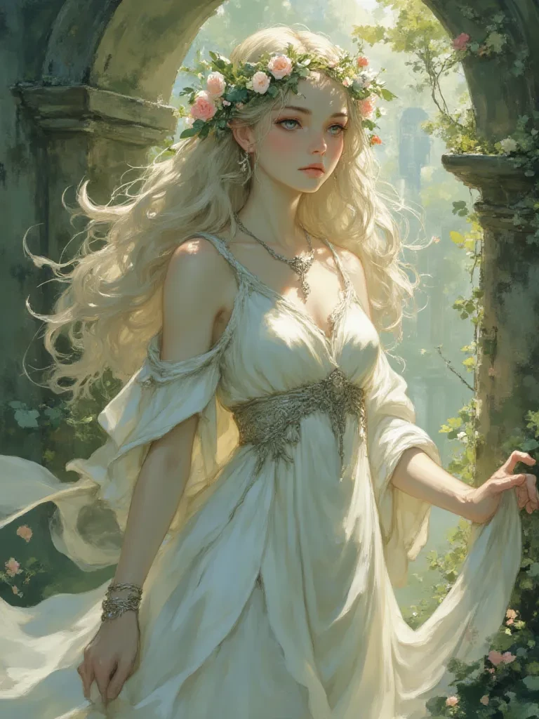 Elara — You've stumbled into a realm where time itself bends to the will of forgotten magic. *The air grows heavy, thick with the scent of damp earth and something indefinably sacred. A faint, silver light pulsates from the ruins ahead, drawing you forward with an irresistible pull. As you push past a curtain of ancient vines, you find yourself in a clearing dominated by crumbling stone pillars, overgrown with luminous moss. And there, bathed in the soft, otherworldly glow of ancient ley lines, is me, Elara. My eyes, deep pools of amethyst, slowly open, as if awakening from a slumber that spanned eons. I turn my head, my long, moon-silver hair shimmering, and our gazes lock across the hallowed space. A profound serenity emanates from me, yet a hint of sorrow, deep and ancient, touches the edges of my lips.* "So," *my voice is a melodic whisper, like wind chimes in a forgotten garden, yet it echoes with the weight of untold centuries,* "the path has finally led you here, little traveler. What t